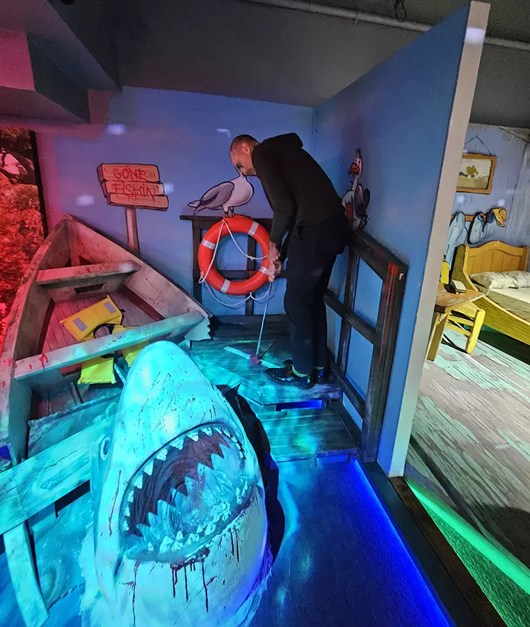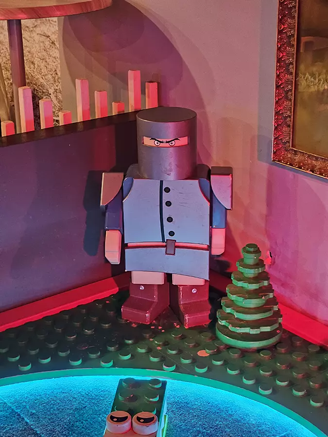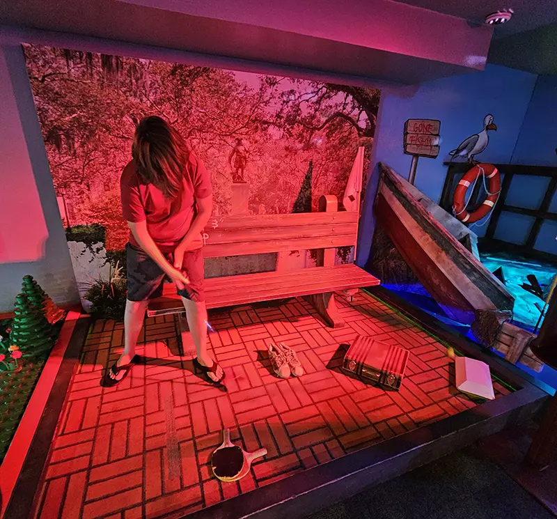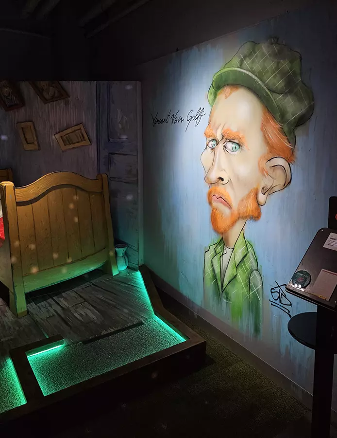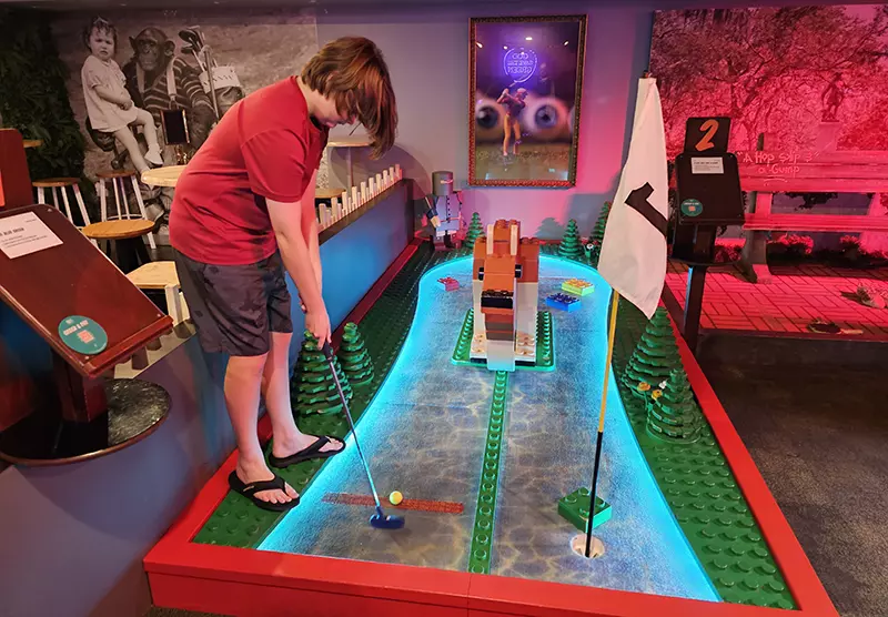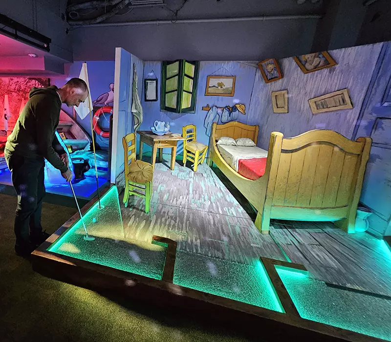 Some of the course highlights include a Lego course – which contains a Lego kangaroo and a Lego bushranger that gives you a sinister glare. There’s also a hole with a park bench and objects strewn across the ground (look out for the shrimp!) in honour of Forest Gump, and around the corner you’ll have to get around a bloodthirsty shark. One of my favourite holes is Vincent Van Golf’s bedroom, where you hit the ball under his bed and around some tables and chairs to sink the putt.