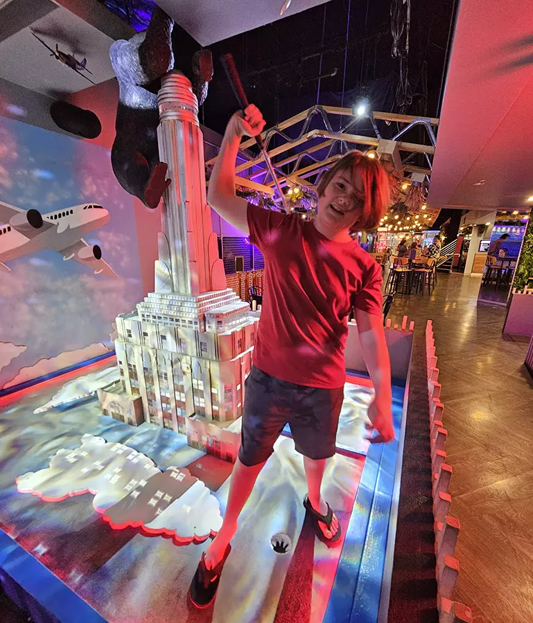 The next hole is a poker machine, which spits out your ball and tells you your score, depending on the luck of the draw, and the last hole called ‘Kong Live the King’ has King Kong hanging above you on the Empire State Building.