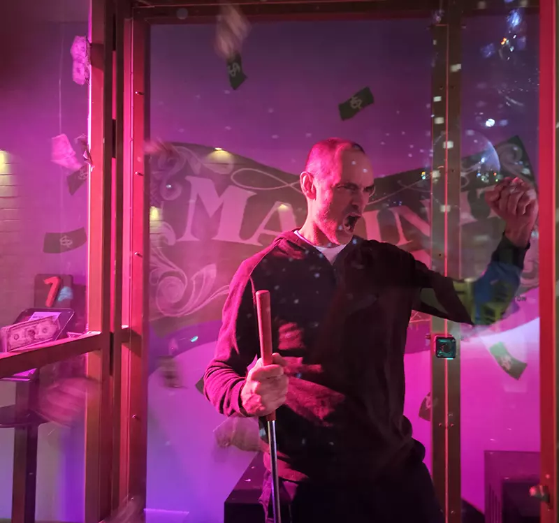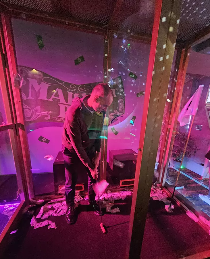 The holes get more creative as you go along, as the seventh hole takes you into a glass room where you press a button and a blower sprays fake cash all around you like you’re Jordan Belfort. Unless you sink this hole in one, it’s pretty hard to get it in the hole with the wind and the cash flying around you. Of course, you could do that when the wind stops but that’s cheating!